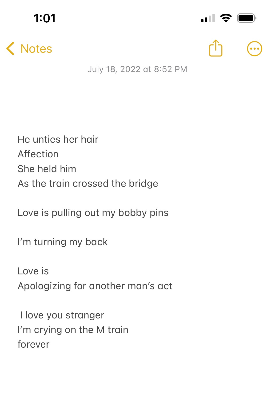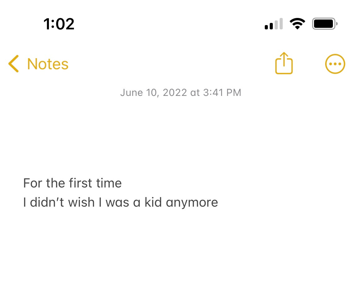 I have been fighting the worst writer’s block this week and I really don’t have anything of note to say. Which makes me feel bad and has been manipulating me into procrastinating sending out this newsletter. But here it is, so. Here are a few screengrabs from my notes app that I just found and don’t make sense and that’s all I have to offer you today. I only remember the context of the first one - it was the first time I was in Cape Cod, Keeler and I were watching kids play on the beach and I realized for the first time I didn’t look at those children with envy because I missed that kind of weightlessness… I had it)